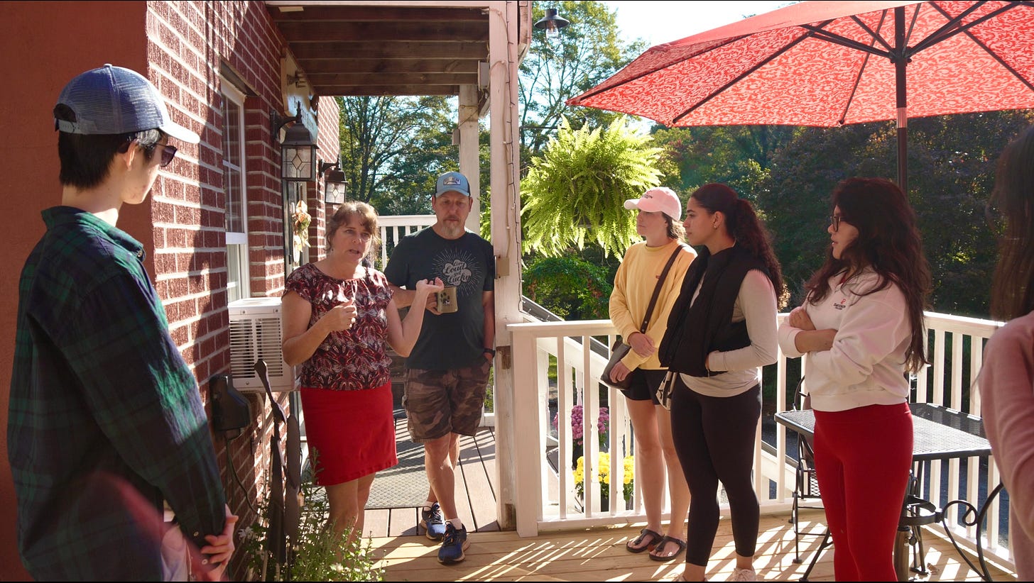 To better understand the needs of the businesses they were supporting, students traveled to Chimney Rock. Entering the town, foundations had been wiped away and piles of rubble were scattered across the riverbank. In spite of the destruction, shops were open, and visitors stopped for lunch at the local smokehouse. Now, over a year after the flood, the town carried a sense of normalcy.