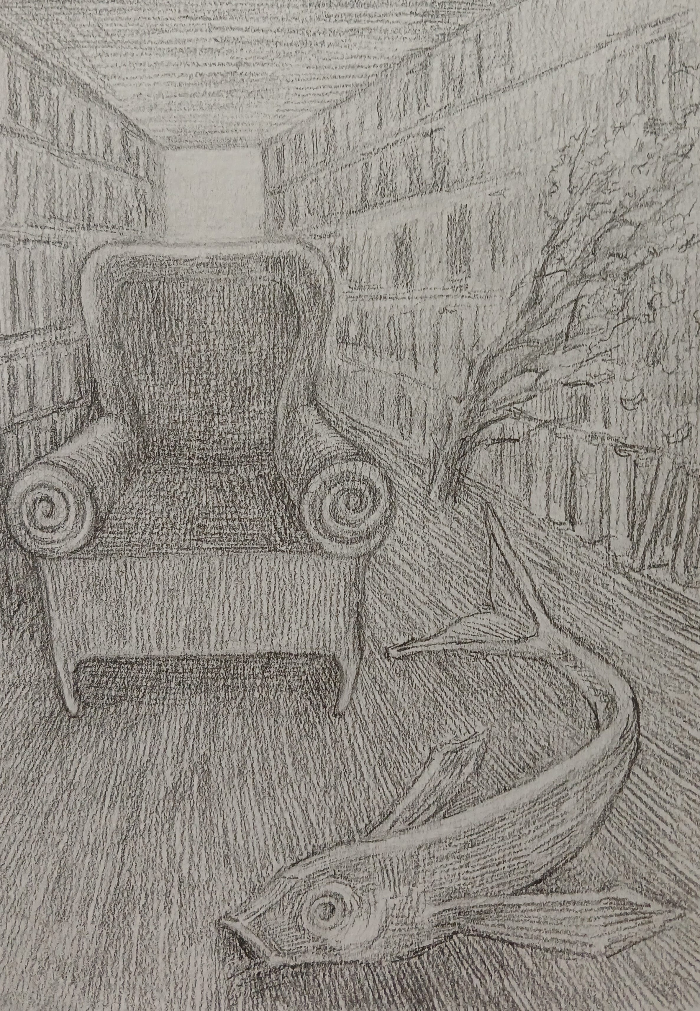 It was closer to a fish, with its slithery surface and the turbid pattern of dark and light green parts. I stood there, fixed like beholding an apparition. It was almost alive, as if it were a fish, living without consciousness. The chair sat in the dim corner like a fish contained in a fish tank, under dim light in the corner of a natural history museum, slithering through the silky ruffles.