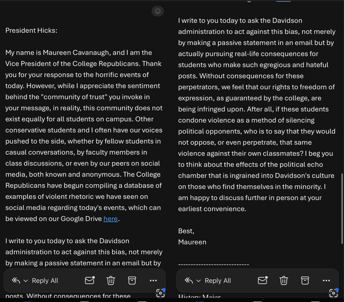 That same day, the Davidson College Republicans filed a complaint with President Doug Hicks about students’ reactions to Kirk’s death. They submitted 94 screenshots of Davidson students’ YikYak and Instagram posts, which they described as “egregious and hateful” for condoning political violence.
